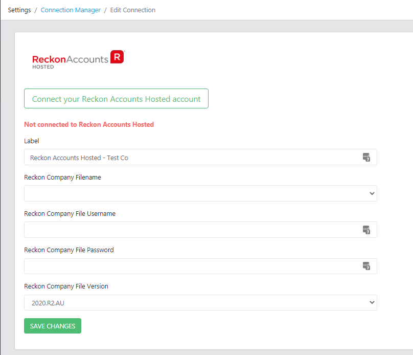 - Enter these details into the respective "Reckon Company File Username" and "Reckon Company File Password"