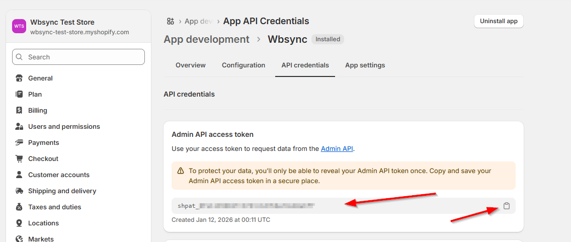 Note: this will only be shown once, so be sure to copy the access token and paste it into Wbsync before leaving the page